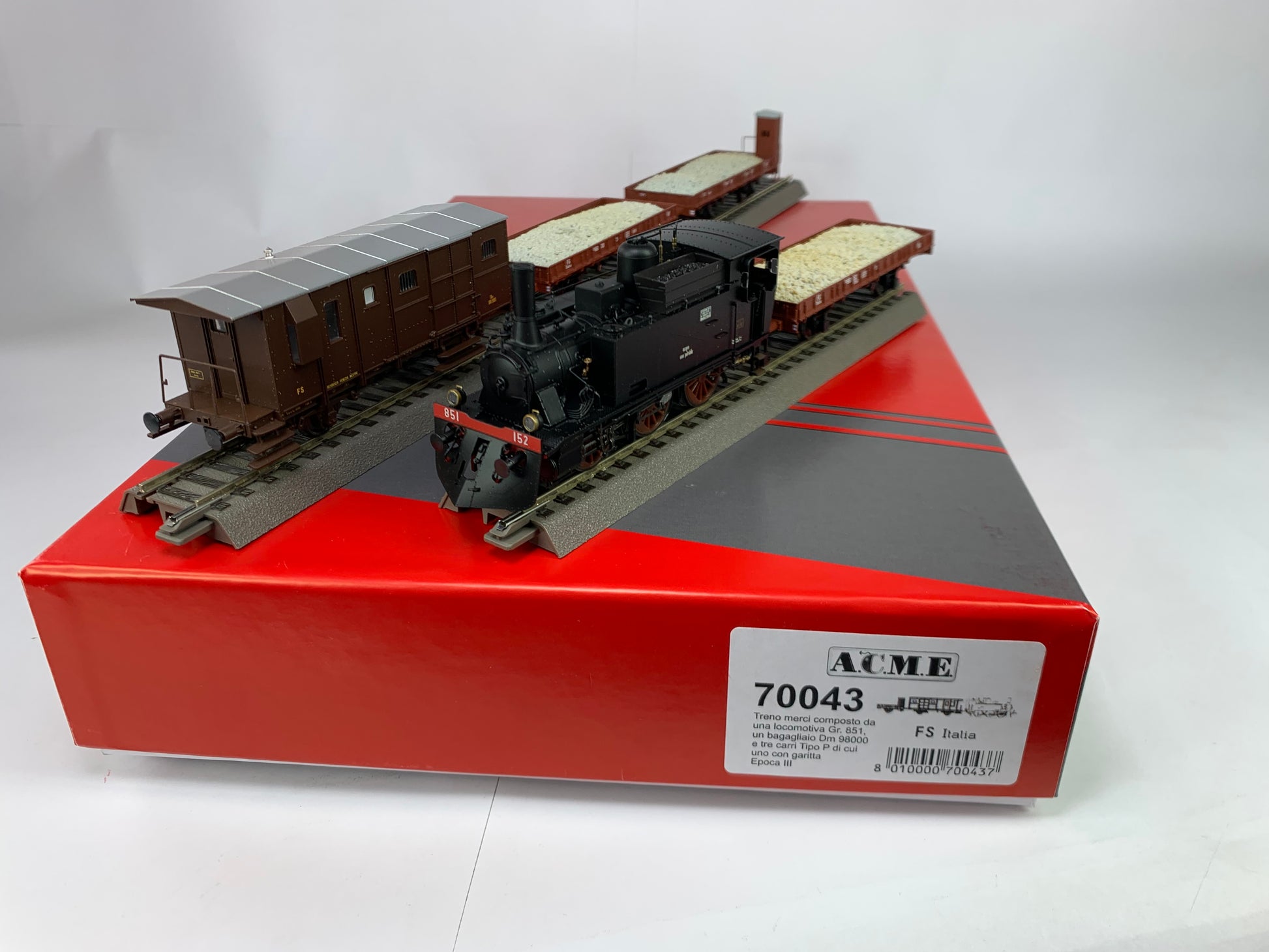 LOCOMOTIVA A VAPORE gr. 851-152 + 3 CARRI PIANALI A 2 ASSI CON GHIAIA E BAGAGLIAIO Dm IN LIVREA CASTANO / EP.IIIa